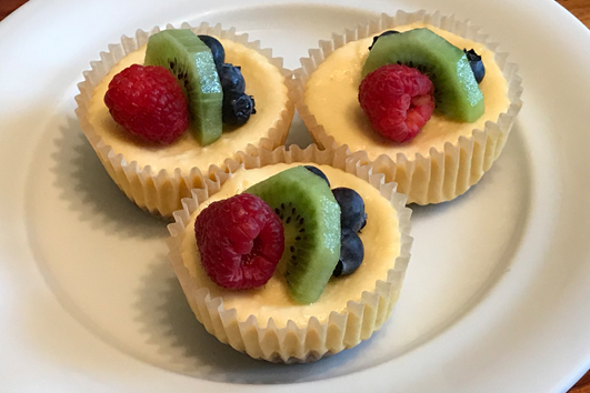 Fruit topping: Peel kiwis; cut each into 6 slices, and then cut each slice in half. Place 1 kiwi piece on each cheesecake. And then top with berries.