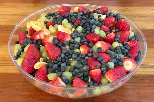 Clean and drain all fruit until completely dry. Keep all the fruit separate, individually wrapped and stored in refrigerator until just before serving. When ready to serve . . . gently layer the fruit a little at a time, to evenly disperse all the colors & not bruise anything. Cover with saran wrap when done.