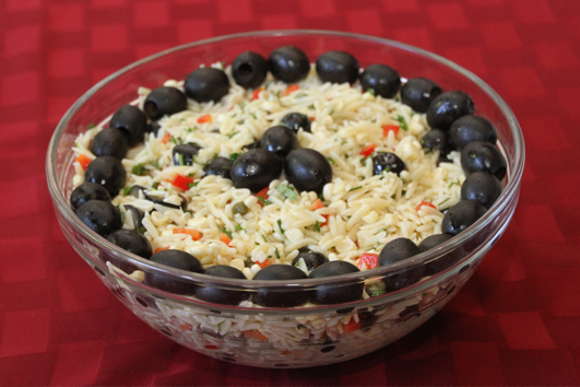 Cook your Orzo pasta according to package directions. When done, drain and place in a large bowl to cool. Immediately pour olive oil and white wine vinegar over the Orzo and stir, so pasta doesn't stick together as it cools. In a different bowl, add the corn, cut off the cob, along with the remainder of the vegetables and herbs. When the Orzo has cooled, add everything together and stir. Pour salad into your desired serving dish and garnish with whole black olives [optional]. Cover with saran wrap and refrigerate several hours or overnight. It's best if made the day before you intend to serve it.