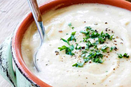 Stir in enough rice milk to give the soup a medium-thick consistency, then add the creamer. Season with salt and pepper. If time allows, let the soup stand off the heat for 1 to 2 hours, then heat through before serving. Top each serving with 2 or 3 garnishes.