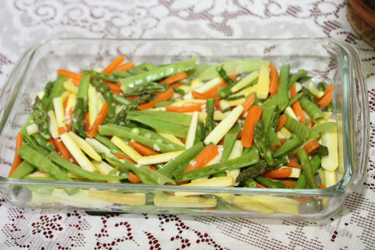 Julienne all the vegetables to approximately 1-1/2” long [length of petite carrots]; making sure to keep each vegetable in separate bowls. Cover each bowl with boiling salted water (except the red peppers & leek) and let stand until the vegetable is bright in color, about 1 minute. Each vegetable may take a different amount of time, so watch closely. Drain immediately into a colander and return to their bowls, covering with ice cold water to halt cooking. After a few minutes & when thoroughly cold, drain again into a colander, and place veggies onto layers of paper towels to absorb most of the water. When vegetables are sufficiently patted dry, they can be mixed together into an oven proof pyrex pan.