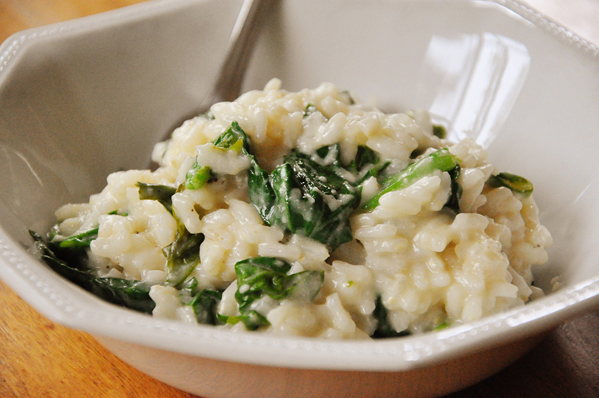 Mix 4 tbsp butter, spinach, Parmesan cheese, and heavy Cream into risotto until fully incorporated; season with salt & pepper to taste.